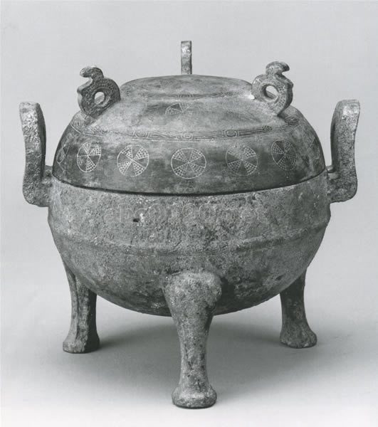 円蓋、鼓腹で、2つの附耳をもち、足は蹄状の球形の鼎である。円蓋の上には獣の形の鈕が3つ付いている。この蓋を逆さまにおけば、物を盛る器としても使用できる。蓋には三段、器には二段の円形幾何学紋様が付けられ、同じ紋様は附耳にもつけられている。他に例を見ない紋様であって、この地方独特のものと見るべきであろう。なお、蓋の一部は補修したもの。出所:中国の器展ー青銅と陶器