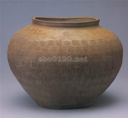 広口の短頸壺で、肩は大きくはりだし、底裏は少し内刳りとなっている。素地は灰青色のきめのこまかい胎で、焼成温度は高く、かたくやきしまっている。底裏を除き、全体に均一に施釉されており、釉は青黄色を呈している。器表には網文状の四角い単位文様が規則的に施されている。出所:中国の器展ー青銅と陶器