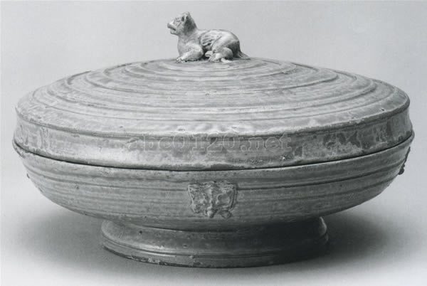 器体は扁平な盒。蓋は被せ蓋で、甲には同心円状に弦文がめぐり、頂部に虎形の鈕がついている。身はやや浅く、胴の両側に鬼面形の飾りが貼りつけられている。高台はやや高い幅広の安定した高台である。身の内面には水波文が施されている。素地は灰白色のきめの細かい胎で、全体に均しく透明釉がかかっているが、釉にはややむらがあり、黄味のある釉調を呈している。出所:中国の器展ー青銅と陶器