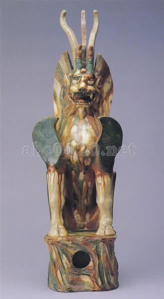 人頭獣身の鎖墓獣、大きく開けた口の両側には鋭い牙がみえ、顎の下には髭をたくわえ、前足をふんばって、高い台座の上に座している。額からは2本の角がのび、頭髪は長く下に垂れている。素地はピンク色の胎で黄釉、緑釉、白釉がかかっている。出所:中国の器展ー青銅と陶器