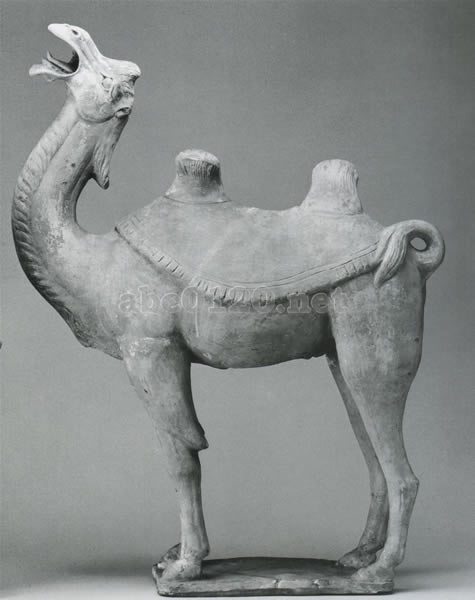 頭をあげ、ロを開いていななく姿をしている。背中の2つの瘤は左右にかたむき、フエルトの敷物を敷いている。尻尾は巻きあがり、臀にかかっている。素地はピンク色のやわらかな胎で、白化粧が施してある。出所:中国の器展ー青銅と陶器