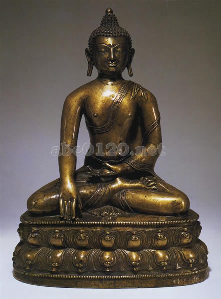 この触地印を結んだ釈迦牟尼仏陀の像は、ツァン地方にある14世紀前半のシヤル寺の様式を示す、最良の作例である。袈裟の縁と仏陀の手の指の爪に施された銅の象嵌や、二重、三重の連珠模様は、早い時期の仏陀の彫刻と比べて、彩色やデザインを豊かに加えている。鋭く少し骨ばった顔貌や、緊張感を保った体は、13世紀前期の仏陀の比較的自然な感じよりも、引き締めた形の意識や装飾的傾向を示している。出所:天空の秘宝チベット密教美術展 2009.09.19更新