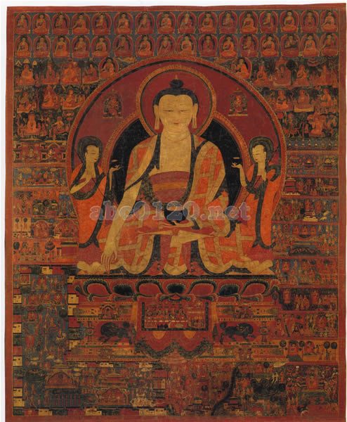 このタンカは、西チベットの、グゲ王朝の首都であったツァパランにて、トゥッチが収集した作品のひとつである。ヴァージニア美術館蔵の釈迦牟尼像と同様、様式化した要素が多くあるが、本図はより大きく複雑で、賦彩に重要な相違がある。トゥッチによれば、これは、彼がツァパランの紅の寺、すなわち、グゲ王妃と、王自身と当時の遊行僧ガウァン・ギャツォにより建立された寺で見た壁画のいくつかと大変似ているという。この僧は、ゲルク派の祖、ツォンカパ(1357-1419)の弟子であるから、彼が遊行したのは15世紀の前半ということになろう。これらのことから、紅の寺の建立年代は15世紀中期から後半頃と考えられるのである。出所:天空の秘宝チベット密教美術展 2009.09.19更新