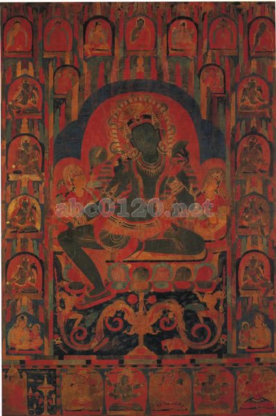 上部の辺りには五仏の列があり、ターラーの仏陀の族の王である不空成就は、二脇侍菩薩とともに中央に描かれている。シュロの木、動物そして何人かの人物が、直立した山の岩の頂上に沿ってあらわれている。本図の主尊の部分の下方の、岩の枠で境界がつくられたところには、菩薩と侍者の座す壁龕がある。底辺に沿って、四角とトウモロコシ型の宝石を交互に繰りかえすデザインの縁で主尊部分と空間が分けられ、5人の素晴らしい尊格が座している。みな六臂で、女尊で、片手に長い刀を掲げている。不空成就仏の忿怒形である甘露軍茶利(アムリタ・クンダリー)か、あるいは緑ターラー自身の別の忿怒形か、おそらくそのどちらかと関係がある。一番左には、チベット人の僧の身なりをした施主が、儀式での奉納の品々の前に座っている。このタンカにアティーシャとドムトゥンがいるということは、おそらく彼らの時代より下った時期のものであろう。僧形の施主はその系統の弟子である可能性が高く、おそらく次の世代の者であろう。これは、一番早くて11世紀の第4四半期頃に位置付け得ることを示唆している。このタンカが12世紀後半を下ることはないことは明らかである。この作品は疑いなく、チベット中央部の早い時期の、最も美しく、稀有な、重要な絵画である。菩薩を主尊とするもの、そしてこのようにアティーシャとドムトゥンというカダム派との確かなつながりを持った作品は、ほとんど残っていないのである。出所:天空の秘宝チベット密教美術展 2009.09.19更新