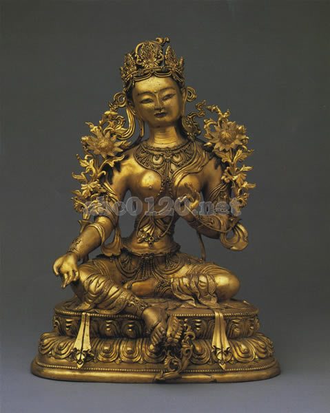 緑クーラーは、衆生を苦しみから救う、八難からの不思議な救済者として崇敬されている。彼女ば仏陀の三生の母″(クーラー・タントラ)という名誉を与えられている。この彫像は、機敏に宙を舞うようにあらわされており、頭を少しかしげ、片方の足を蓮華座に引き上げて座り、もう片方を横に傾けて、通例の通り、ゆったりした遊戯坐をとっている。右手は、優雅にのばし、掌は与願印を結び、青蓮華の茎を持っている。左手には別の蓮華を持ち、3本の指を上の方にのばすことによって三宝の守護の身振り(施無畏印)を作っている。2本の花が、写実的に造形された葉や花弁を贅沢につけて、風に舞うように腕を枠どっている。意匠を凝らした瓔珞の宝石と、軽くねじれた条帛の金属製の堅い動きが、しなやかなほっそりとした体に精力を与え、彼女の活発な性質を表現している。当初から埋め込まれている宝石が2、3個今も残っており、金銅の表面がつくっている豊かな表情に、色のポイントを加えている。