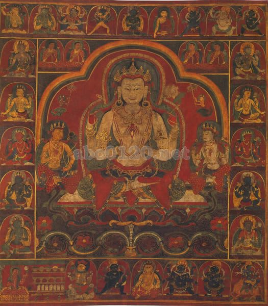 この白い、四臂の六字観音(シャッドアクシャリ・アヴァローキテーシュヴァラ)は、数珠、蓮華、念珠を持ち、濃い赤、緑、青色の衣を着て、目立つ大胆な金の装身具で飾られており、渦を巻いた花唐草文様から茎が出た蓮華座に座っている。同様の文様は、13世紀後期のタンカや、14世紀前期の、シャル寺の壁画にあらわれている。大きな赤い光背の内側には、二臂の金色の菩薩と四臂の白い菩薩が両側に座っている。おそらくカダム派の二人のラマが、上部の両側に座している。最上部の縁に沿っては、左から右へ、文殊、ヴァジュラヴィダーラナ、仏頂尊勝母(ウシュニーシャヅィジャヤー)、二臂カーラチャクラ、中央に金剛薩埵、釈迦牟尼、二臂ヘーヴァジュラ、白色不動、そして青色金剛手である。両側の縁には、四臂の、上から白、黄色、赤、青の菩薩が、外側に顔を向けて座っている。緑ターラー(左側)と白ターラー(右側)が、両側のアンサンブルを完成している。下の列には左から、施主、そして様々な守護尊や福の神がいるが、それは、毘沙門天、不動、ジャンバラ、六臂大黒、大黒パンジャラナータ、ペンデン・ラモである。これらの小像はすべて、赤い、金の縁のある龕におり、細かい赤い線で描かれた雲文が周囲の空間を埋めている。出所:天空の秘宝チベット密教美術展 2009.09.19更新