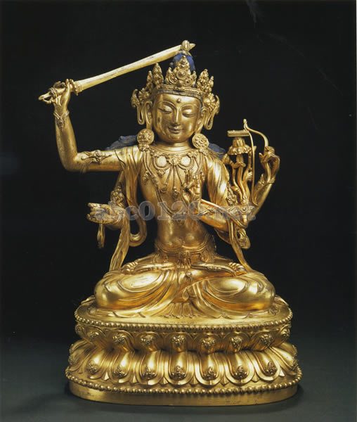 この彫刻は永楽年間の典型的な作例である。サイズとほんの小さな2、3の部分だけを異にする、ほとんど同様の作例が、大英博物館に所蔵されている。ティークシュナ明利文殊が、W.E.クラークの乾隆帝コレクションのカタログに見られるが、その四臂もまったく同じ持物を持っている。出所:天空の秘宝チベット密教美術展 2009.09.19更新