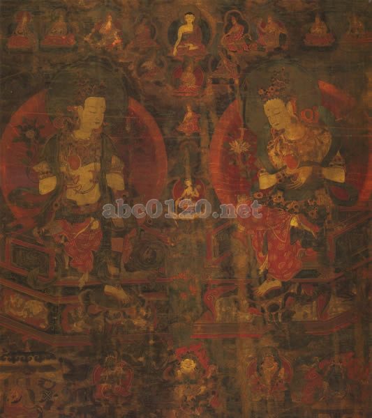 問答する文殊と弥勒は、インドの学僧でチベットに11世紀中期にやってきたアティーシャと、その高弟トムトゥン(のちに、チベットでは、ダライラマ1世の化身として尊敬された)によって奨励されたテーマである。彼等はそれぞれ、覚りへの細い道のりをつくる、深遠な智慧と、崇高な慈悲の行為をあらわしている。この二菩薩は、本図では、多数の小像に囲まれた、手の込んだ漆の椅子に座す姿に描かれている。少し互いの方を向き合った、彼等の優美な白い体は、衣の控え目で抑制された調子や、まるで彼等が漂っているかのように見える、全体の暗い雰囲気とは対照的である。中央の縦軸に沿って、上から下に、釈迦牟尼仏陀と、゛六飾二勝″として有名なインドの学僧のグループが、釈迦牟尼の両脇から下に半円形に配置されており、そのすぐ両脇には龍樹と無著も含まれている。ー組のチベット人のラマの像が、それぞれの上部の角を占めている。構図のちょうど中央には、小さな白蓮華手観音が片足を下ろして遊戯坐をとり、般若経の天来の語り手であることを示している。下の列には、僧形の施主が左端の角にみられ、四体の守護尊、すなわち、緑ターラー、毘沙門天立像、ジャンバラ座像、そして四臂大黒立像が描かれている。
