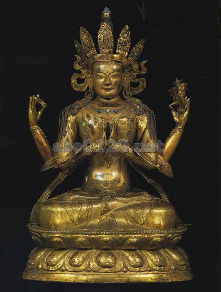 これらの、堂々たる彫像は、打ち延ばした真鍮でできており、漆や金箔、彩色が施され、半貴石で飾られている。そしてこれらの巨像は、かつて、チベットやモンゴルの大寺の講堂の祭壇上に一列に並んでおかれていたときの、強い印象を与えるオーラを発している。均整のとれたプロポーションをし、顔は、造作が大きくインド人の目をしていて、優しい表情をみせる。像容は完全で緻密に描写されている。衣は平面的に、繊細に折り畳まれている。宝石は豪華でしかも洗練されている。 18世紀のスタイルである、形式へのこだわりが見られ始めているが、それぞれの部分の美しさは犠牲になっていない。部分的には、中国の乾隆年間(1736-1795)の仏教美術に見られる発展を予感させるが、この様式は、チベットの伝統の中に根強く存在するものである。出所:天空の秘宝チベット密教美術展 2009.09.19更新