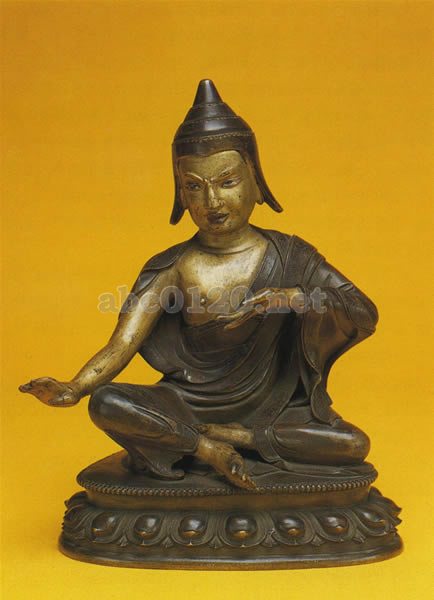 一方では、その顔の緊張している表情(清代の彫刻では珍しい)からは、大成就者の像に似つかわしい。他方では、月称の手の論義の位置からは、大学僧の像と矛盾しない。 出所:天空の秘宝チベット密教美術展 2009.09.19更新