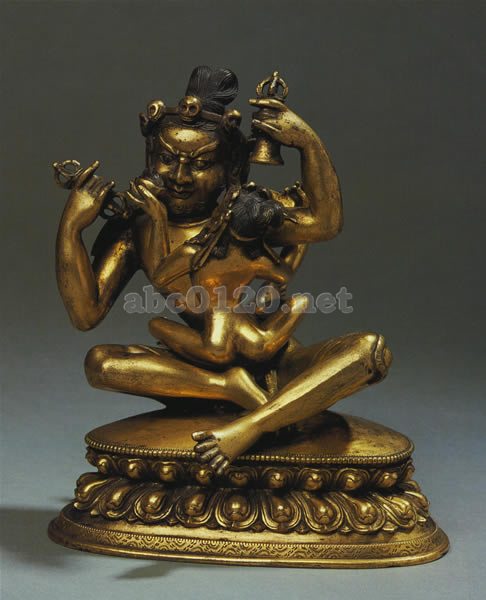 ガンターパとその配偶者は、パラマスッカ・チャク・ラサンヴァラとヴァジュラヴァーラーヒーのように、合体した姿で示されている。このふたりは、複雑で、魅力ある光景を見せている。大成就者の足や身体や腕の力強い対角線的な動きは、その配偶者の油断なく曲げている身体で完成されている。彼は、慈悲の金剛杵と智慧の鈴を持ち上げている。彼女は、ヴァジュラヴァーラーヒーの持物である金剛包丁と髑髏杯を高く持ち上げており、彼女が研ぎ澄まされた智慧の象徴であり、世間的なものを覚りの醍醐味へと変質させたことを象徴している。出所:天空の秘宝チベット密教美術展 2009.09.19更新