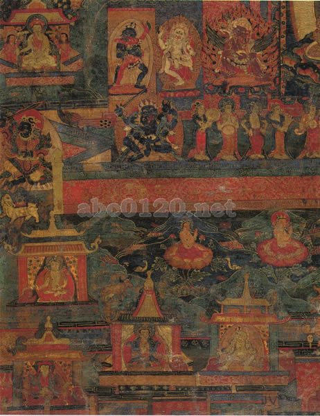 この珍しい絵画は、宮殿の下から3層に父母仏の尊格を描くという特徴のある画題の早い作例とみられる。同じ画題の表現で後のものでは、ハンブルクのエッセン・コレクションにある。山を強調せず祠堂を列挙するという画面構成の型は、一地域で16世紀末から発展して特殊な形式として続いたものであろう。チンゴ・リンポチェによれば、このタイプは、死に際して転生を求める信者に観想させる偉大なる銅色山の浄土の姿をあらわしているのではないかという。出所:天空の秘宝チベット密教美術展