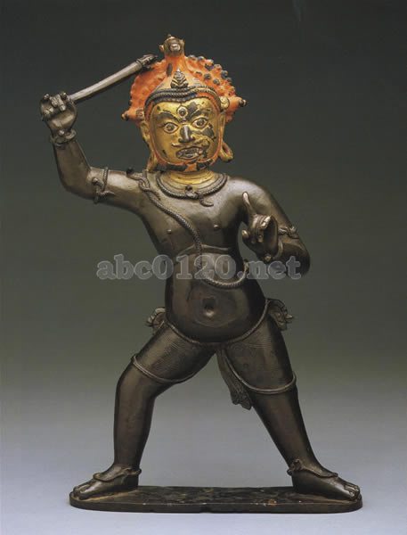 この彫像は、チベット彫刻におけるこの重要な尊像の最も早い作例のひとつである。 12世紀後半から13世紀前期頃に制作年をおくことができるが、制作地域を特定するのは困難である。平板な顔と硬い作風や、ラカンソマの作例と近似することなどから、西チベットのものと考えられる。着衣の文様や衣の縁のスタイルは、12世紀後期頃の中央部の彫刻や絵画に見られる。充実したなめらかな量感は、蛇の瓔珞や腰衣のふちの抑制されたカーブと一体となっている。面白いことにこの初期の馬頭には、宝冠や髑髏が見あたらない。装飾は簡素なものである。鍍金と彩色は後補である。出所:天空の秘宝チベット密教美術展 2009.09.19更新