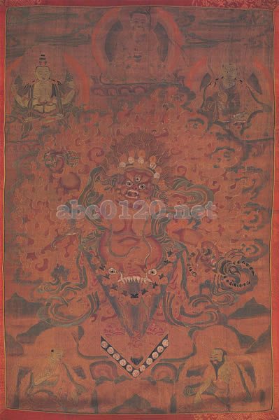比較的大まかなやり方で仕上げられた、この絹本の絵画は、おそらく東チベットの流派のものであろう。赤っぽい桃色と橙色の色調を中心とした赤色タンカのスタイルで描かれ、部分的に青、緑、黒、白が使われ暖色の色調を補っている。これはグル・リンポチェが恐ろしい尊者ダクマルの姿に変化した姿を描いたものである。解脱への活動をする最も恐ろしい姿をとるということで、巨大な蠍と金剛杵を持ち、腰から下は金剛橛のような形に変形しており、串刺しにされた邪鬼のいる三角形の台座の上に突き刺さっている。主尊の背後には大きく優美な火焔光背があるが、全く力強さのない様式化された火焔は、17世紀の新メンリ様式に関連づけられる描き方である。上方には六字観音とパドマサンバヴァを