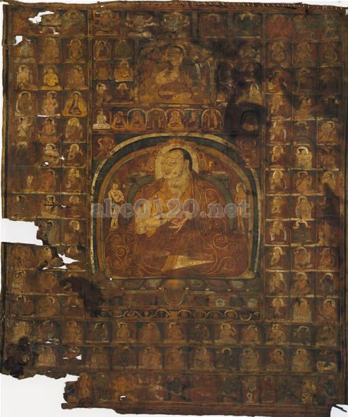 このタンカの背面、主尊の裏に墨で以下の賛詩が書かれている。比類無き偉大なる訳経官であるあなたは、私にとって第二のブッダのようにみえます。あなたの分離することのできない智慧と覚り。紛れもないダルマターラ尊。私は尊敬の念をもってあなたに従います。」ほぼ間違いなくこれは、訳経官にして西チベットにおける初期の重要な伝道者であるリンチェン・サンポ(958-1055)のことを指している。リンチェン・サンポは、西チベットの王の後援を受けてカシミールとインドに17年間留学し、そこで彼は経典はもちろん、タントラや専門的経論など多数の重要な仏教文献を翻訳した。彼は後伝期のチベット仏教を主導した人物のひとりなのである。彼は第二のブッダと呼ばれて称賛され、伝説的な聖者である訳経官ダルマターラにも擬された。そしてその姿は唐代の中国からインドヘと翻訳するための経典を求めて旅した中国僧玄奘がモデルとなっている。