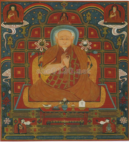 3)賛詩は「法の祖師」(Choje)と記し、「法の王」(Chogyal)とは記さない。また主尊頭上の小欄に描かれた小さなラマ像には「ササン・マティ」と記名されているようである。タンカにおいては同一の作品のなかで主尊が別の相をとって繰り返し表現される場合があり、それは主尊が最も一般的な相以外の相で描かれている場合が特に多い。それでもこの作品の場合まずこのササン・マティなる人物が主尊像主の候補から除外される。画面下部の主要