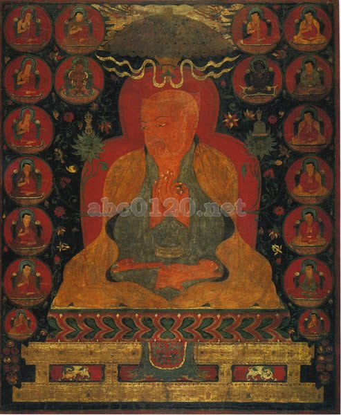この作品は、初期サキャ派五大先師の第1、サチェン・クンガ・ニンポ(1092-1158)の肖像である。彼の父クン・クンチョク・ギャルポは1073年にサキャ寺を創建し、新たな宗派をたてた。それはガーヤダラによって伝えられ、ドクミ訳経官によって翻訳されたヴィルーパの教え「道果説」に基盤をおいた宗派である。クンチョク・ギャルポはサキャ派の座主を神聖家系クン一族の世襲としたので、サキャ派の伝統は、俗人としても、また聖職者としても受け継がれた。クンガ・ニンポは観音菩薩の生まれ変わりと信じられており、文殊と大成就者ヴィルーパの特別な導きを受けた。ヴィルーパはクンガ・ニンポの精神修養の最も重大な時期に、暗い茶色の姿で一ケ月のあいだ彼のもとを訪れたという。