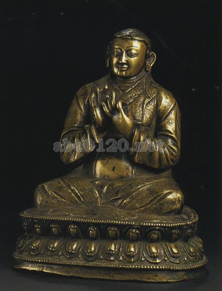 この像は折衷主義的性格をもっており、多くの先行する美術のスタイルヘの関連を示しているが、量塊感における自然主義的傾向が進んでいる点と衣のひだの大胆な自由さからみて、おそらくこの像は15世紀後期から16世紀前期にかけて制作されたものと考えられる。16世紀後期に制作され、この像よりさらに高度に自然主義的傾向を強めているカルマ・ドウツィ像よりも、この像が先行するのは確かである。出所:天空の秘宝チベット密教美術展