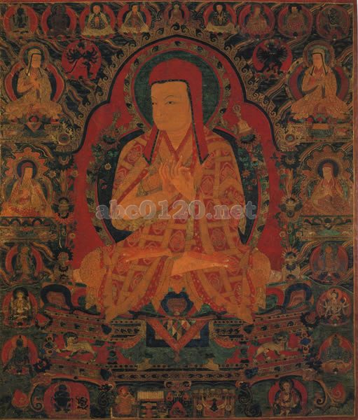 パルやその他の人々が指摘したように、この絵はサキャ派のラマたちを描いた組作品のなかの1点てあると思われる。こうした組作品に属するタンカは数多く知られており、例えばジョン・ギルモア・フォード夫妻やマイケル・ヘンス、ロサンゼルス・カウンティ美術館のコレクションなどに作例が見いだせる。インド・ネパールの様式的伝統との関連を示しつつ、チベットにあまねく根付いていたこの絵のスタイルは、この絵がチベット中央部に由来することを示している。この絵はおそらくツァンから来たものであろう。特にツァン地方の多くのサキャ派寺院と関連する自派においてみられるこのスタイルの伝統は、数世紀にわたってこの地域で保持されたのである。出所:天空の秘宝チベット密教美術展