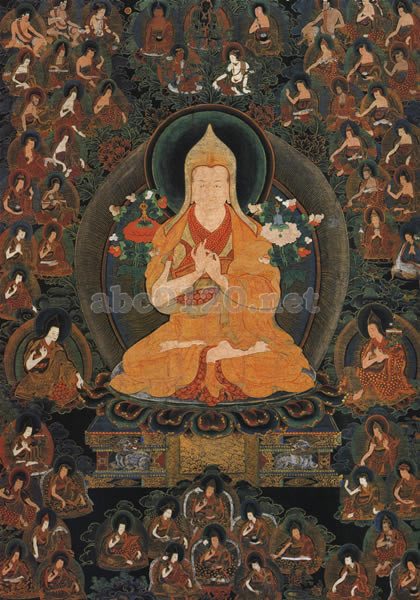 このタンカには年紀はなく、施主や作者についても名前以外のことはわからない。しかしながら、5世と6世のダライラマが描かれている点は、この絵の成立時期が17世紀後期であることを示唆する。崇敬の印として、吉兆を示すものを持った同時代の宗教的人物を含めて表す慣習化があり、この場合、5世ダライラマは法輪を、6世は長寿の瓶を持ってあらわされている。銘文から示唆されるとおり、この重要なタンカは、絵師キェンラブ・ジャムヤンによって制作されたと考えられる11点の作品群のうちの第一番目にあたるものである。出所:天空の秘宝チベット密教美術展