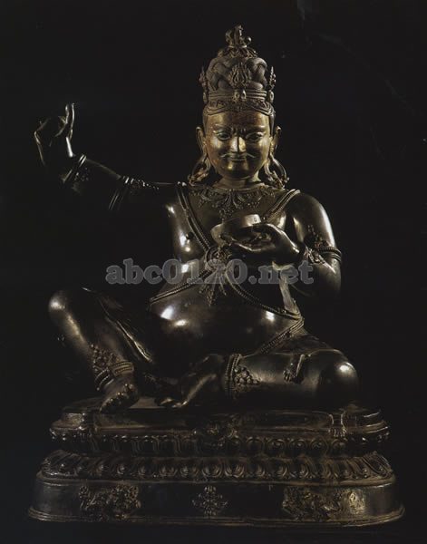 大成就者にしてサキャ派の祖師、ヴィルーパは指で太陽を止める姿勢をとる。ここでは威厳のある像としてあらわされ、インドの長者のように立派な髻を結い上げる。二重の瓔珞を胸前で交叉させ、正面と背面で円形の留め金で留めている。同じような装身具が腕や腰や首にも付けられる。虎皮を腰に付け、虎の足を左脚や台座の背面に垂らす。像の力作は、ゆったりと高く結い上げた髻を宝飾で留め、正面の頭飾と背面の冠帯に坐化仏をあらわす。尊厳かありさらに活力のあるヴィルーパ像は鋭く縁取られた眼で前を見つめ、苦笑いを浮かべ整えられた口髭にしっかりと形作られた顔貌をとる。写実主義的な表現や優美な宝飾の表現など様式的な要素は15世紀第2四半期のギャンツェのクンブム寺の様式と運づけられるが、明快な線と宝飾の入念な精巧さから、これよりやや早い1400年頃に編年されたものと思われる。出所:天空の秘宝チベット密教美術展