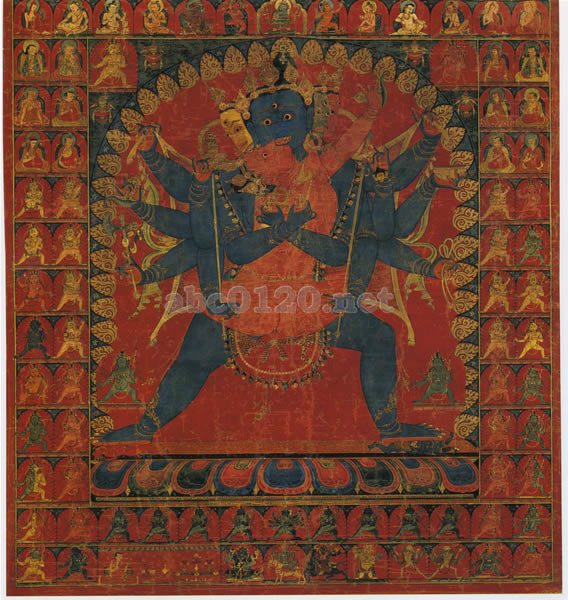 この絵は、14世紀のネパール仏教美術の様式的伝統を利用しているものの、引き締まった堅い線によって力強い量感と活発な力強さとが共存しているチベットのものである。劇的で緊迫感のある形はチベットのものに特徴的である。そのモニュメンタルなスケールは、トゥッチが記すように、15世紀前期のギャンツェのクンブム寺の主だった壁画にみられるものに関連づけられる。しかしツィンマーマン・コレクションの14世紀後半の赤色ヤマーりのタンカと明らかな様式的類似があることから、この作品も、それに前後する時期のほうにより年代が近いと思われる。実際に本作品は、その特徴的なスタイルが関連づけられる赤色ヤマーりやその他のタンカと同じ様式の画派か同じ僧院のものと思われる。クンガ・ニンポのような初期のサキャ派の高僧の存在がこのようなサキャ派画壇を支持したのであろう。この絵は、15世紀第2四半期のギャンツェの壁画よりも古い14世紀後期のモニュメンタルな作品として、非常に重要であり、また14世紀後半のサキャ派と関連する明らかに重要な芸術様式と定義づけられるものである。出所:天空の秘宝チベット密教美術展
