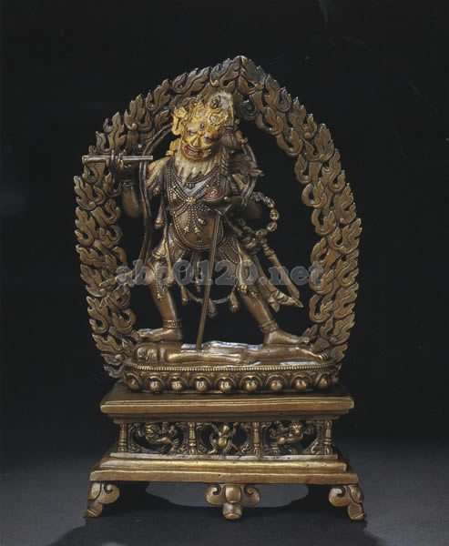 火焔光背に包まれて、大黒天は戦闘の姿勢で立ち、両足で横たわった人物像を踏みつける。人の大腿骨で作られたラッパを右手に持ち、髑髏杯を左手に持つ。左腕で槍を抱え、髑髏をつないだ環飾を左腕に通す。この大きな環飾に水瓶と剣をくくりつける。人の生首をくくりつけたガーランドで身を飾る。ゲッティによって紹介されたチベットの伝承では、サキャ派の有名なラマ、パクパ(1235-1280)の前に現出した大黒天が、この「ブラフマナ(婆羅門)の姿としての護法神」であったという。そして、モンゴル皇帝フビライ汗にヘーヴァジュラ・タントラの意味を説明するのを助けたという。この像とエルミタージュ美術館のシンハヴァクトラ像は、ウーフトムスキー大公コレクションの寂静尊と忿怒尊の12体のうちの二つにあたる。これらは同じパターンのもとに、同じ工房で作られており、すべての像の形が非常に似ている。すべての彫刻は、同じ技法でスタイルも似通っている。尊像はそれぞれ蓮台上に立つか座るかしており、蓮台は方形台座の上にのり、その脚部は意匠化された足の形になっている。台座は、前後二つに分けて鋳造され、一つに合わせている。台座の正面中央には、高浮き彫りのパネルがあり、人物1体、獅子が2体、4基のストゥーパ形の支柱があらわされる。小さな像をあらわす浮き彫りは、チベット美術における、いわゆる東インドの鍍金しない造像流派の原型をしのばせる。出所:天空の秘宝チベット密教美術展