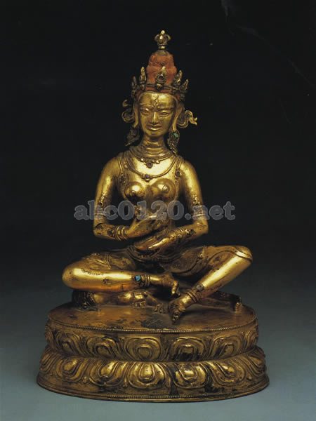 台座は真珠で縁取られ、蓮弁は単純であまり精緻ではない縁取りがなされている。この蓮弁の様式は、とくに15世紀から16世紀の作例に見られる。細身の体躯や宝石の様式などの要素がタンカ中の尊像に類似している。この像もこの時代の同じ地域のものであるといえる。チャンドラ・リーディによる近年の興味深い考察があり、この作品がチベット中央部の作品と断定している。出所:天空の秘宝チベット密教美術展