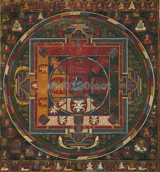 この曼荼羅の秘密集会は、タントラの王として知られ、父タントラ系の基本的な型である。中央に六臂三面の座った阿閦金剛が、明緑色の六臂の神妃を抱擁している。阿閦金剛はその他の五仏の残りの四尊に東西南北を囲まれ、その他の四方を4体の仏母に囲まれている、天空の宮殿の円の外側にはラマや大成就者たちが下方に描かれ、護法尊や象徴物が配される。背面の銘文にラマ、ケズン・クンガ・レクパの名が見られる。サキャ派と関連づけられるツァン地方の14世紀後期の絵画の様式をあらわす重要な作例である。出所:天空の秘宝チベット密教美術展