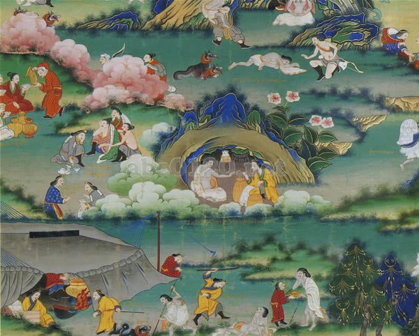 べきであると説いて、彼女を改心させようとする。ミラレパが、マルパが別れの際に与えた巻物を開くのはこの時期である。その教えに従い、瞑想を行い、飛ぶ能力を得る(7)。ミラレパは、下で畑を耕している親戚に飛んでいるところを見られている。ミラレパがこの修行期の洞穴を出るときに、鉢を落としてイラクサの鉢があらわれる(8)。明るい緑色が、このタンカの全体の色を占め、より構築的な形を用いている他の画幅とのコントラストをつけている。それぞれの画幅に描かれている小さい人物は、生き生きとして熟達した、明るい色彩によって描かれている。