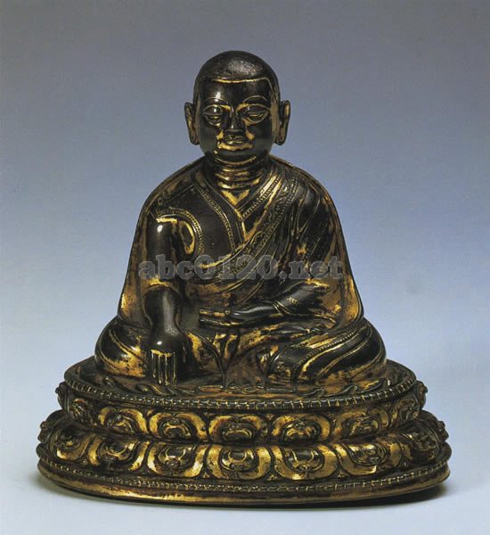 この開祖の像は、このラマの古い作例としては数少ないもので、小さいがまとまりのある魅力的な姿である。顔全体が丸く、重々しい瞼の目、穏やかにほほえみを浮かべた表情はおだやかな姿勢をとる。衣文は叙情的なリズムの襞をえがく。衣のへりに真珠を付ける技法は、13-14世紀の彫刻に見られる。像底にふたがあり、図式化した羯磨杵が中央についた蓮の形がある。出所:天空の秘宝チベット密教美術展