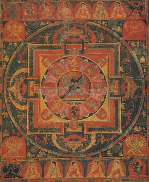 中心の曼荼羅建築の中心に、明青色のヘーヴァジュラがおり、その16本の手には白い髑髏杯を持ち、暗青色の「智慧」の神妃ナイラートミヤー(無我女)を抱きかかえる。8体のさまざまな色の従者の女尊が、中尊を囲む桃、赤、明黄色の蓮弁の上でさまざまな向きで踊る。四方には、甘露瓶が蓮葉の外側と外側の曼荼羅宮殿の城壁との空間に対角線状に配される。曼荼羅宮殿の城門は、宝石や幡や牙をむいた獣口のようなアーチで飾られ、各方向の門ごとに色が異なる。その外側は、星の粒のある虚空が描かれ、その外縁は、金剛杵をつないだものと、花文をつないだ輪である。その外側には成就者と世界の神が八つの屍林の情景の中に配され、密教外の世界をあらわしている。4体の白・黄・赤・縁のヘーヴァジュラ形の禅定している父母仏が、円の外側の四隅を占める。左下から時計回りに、大日ヘーヴァジュラ、宝生ヘーヴァジュラ、阿弥陀ヘーヴァジュラ、不空成就ヘーヴァジュラである(中尊は阿閦と関連づけられている)。上部の一列にはカギュ派の尊像と祖師が描かれ、秘密集会父母仏、執金剛、ティローパ、ナーローパと3人のラマが描かれている。チャクラサンヴァラ父母仏が右端にいる。下段の一列には、左端にロン・ヘロ・ヤマーンタカ、5人のラマ、四臂ヘーヴァジュラ父母仏が描かれている。出所:天空の秘宝チベット密教美術展 2009.09.19更新