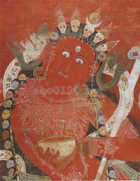 ここでは、赤色のヴァジュラヴァーラーヒーが左足だけで立ち、舞踏の姿勢をとり、横たわって頭を左にひねったバイラヴァ(シヴァ)を踏みつける。女尊は髑髏宝冠をつける。中央の髑髏の上には法輪をのせる三日月形がある。顔の右側に青色の牝豚の頭があるが、損傷がひどい。白い花柄の天衣と冠飾をつける。金の耳飾り、腕輪、腰帯を付ける。