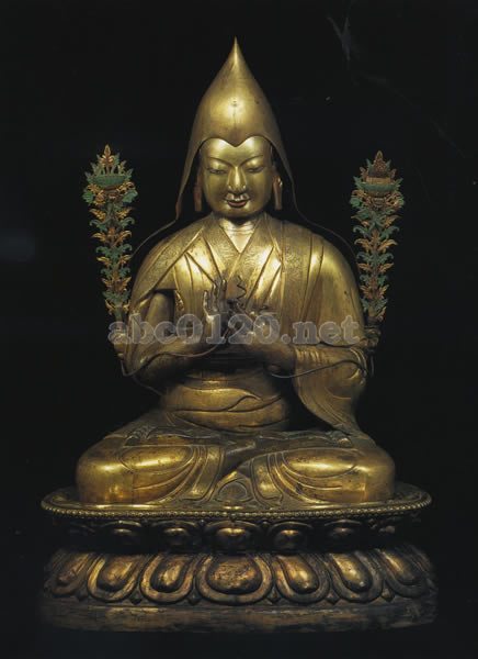 この彫像は、知られている大型のツォンカパ像としてはもっとも良いもののひとつである。優れた技巧と、肖像としての威厳と、印象的で自然な人体表現をあわせもつ。出所:天空の秘宝チベット密教美術展 2009.09.19更新