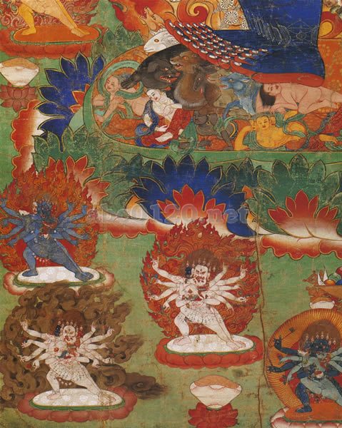 このすばらしいタンカは、この重要な尊像の現存作品の内でも、サイズの壮大さ、尊像の強烈な力、色彩の威力があり、最も壮観な作例のひとつである。力強さと大きさでは、そのほとんどが残念ながら失われてしまったチベット寺院の大壁画の表現と肩を並べるものである。様式的にはラサのデープン寺の壁画に近い。これはこの作品がこの地域の同じ時代のものである可能性をしめすものである。デープン寺壁画とこの作品はともに、単純で広く処理された形の力強さと強靭で太くて肥痩のない輪郭線を用いている。この線描の様式は、フォード・コレクションの1642年以前の作であるペンデン・ラモ像にみられる様式に由来するものである。このヤマーンタカ像も、ラサ地域で17世紀後半のダライラマ5世の時代に盛行した新メンリ様式から発展した作例であるといえる。出所:天空の秘宝チベット密教美術展