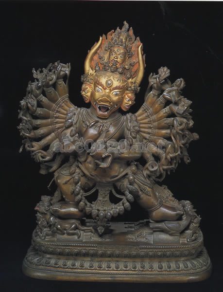 この忿怒尊の像は、図像的にたいへん複合的である。9面あり、中央面は水牛である。三十四臂十六足で、足には鳥や獣を踏みつけその下には人や神々や邪鬼が下敷きになる。主要な持物として、金剛包丁、髑髏杯を胸前の手に持つ。この像は清の乾隆年間の作で、台座の正面に「大清乾隆年敬造」の銘文が記される。出所:天空の秘宝チベット密教美術展 2009.09.19更新