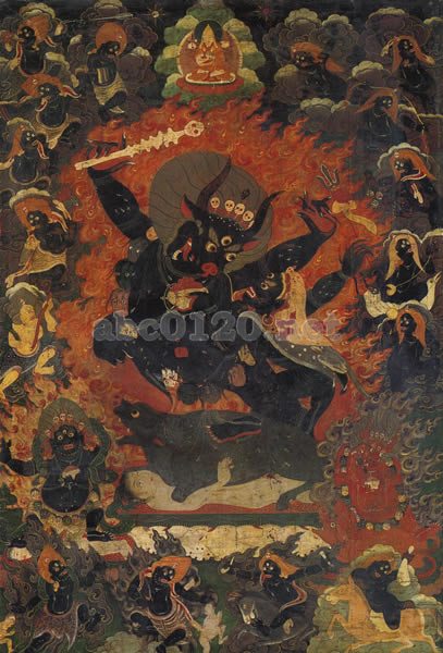 ヤマ法王(ヤマ・ダルマラージャ)は、頭が水牛の姿をした古代インド神話上の死神の王であり、地獄の門で死者の魂を審判し、従者が臨終に際して迎えに来る。仏教では、文殊が最も恐ろしい神を、護法尊(ダルマ・パーラ)かつ、チベット仏教の実践における主要な守護尊として、支配の許に入れたものである。ヤマを調伏する者である文殊はツォンカパと深いつながりがあるため、とりわけゲルク派では重要な尊格である。ツォンカパの姿が中央部上方に唯一忿怒尊ではない尊像として描かれる。これによってこれがゲルク派の作品と比定できる。