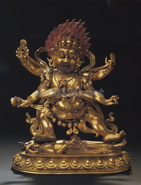 天衣をはためかせ、力強い姿勢を強調している。自分が降伏した者として仰向けに臥した象頭のガネーシャを踏みつけている。ガネーシャは髑髏杯を持ち、装身具には玉が貫入されている。巨大な髑髏冠におされた金箔の効果も相俟って、炎のように逆立った炎髪が光背のようにあらわされている。頭部が巨大な大きく明確な顔貌が、活発な写実性によって、作品の中心的表現となっている。出所:天空の秘宝チベット密教美術展