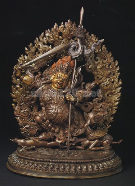チベットの文献でのこの神の記述は、ほとんど完全にこの尊像の図像と一致する。ベクツェは、人馬の血の湖の中にある山の頂上に立つと記される。左足で人間の死体を踏みつけ、右足で馬の死体を踏みつける。手足は細く短い。口を大きく開け端から生暖かい血が吹き出している。舌を巻き上げ、鋭い銅の牙をむきだす。眉と頭髪は、燃え立つような赤色をしている。三眼は、忿怒の目で仏法の敵を見据える。右手で火炎宝剣を天に振りかざす。左手に橙色の敵の心臓を口の近くで持ち、それと同時に弓矢をつかむ。左腕で、暗赤色絹のはためく幡の付いた槍のような珊瑚の杖を抱える。銅の胴甲を付け、赤絹の外衣を付け、茶色がかった牡山羊の皮の外套をまとう。50人の生首でできた首飾りをつけ、赤い皮の長靴で足を固め、像全体が紫の火焔光に包まれる。 出所:天空の秘宝チベット密教美術展