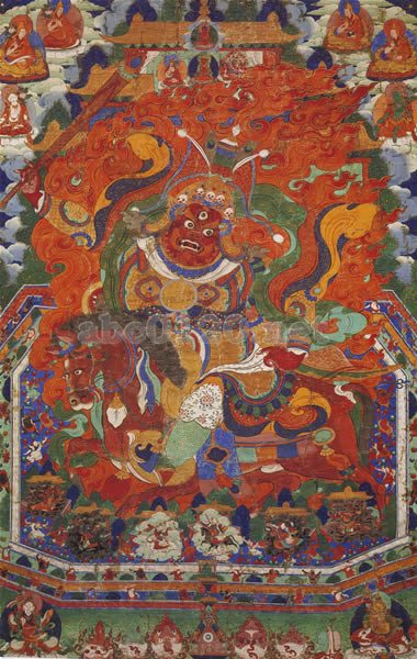 この絵画は、優れておりドラマチックである。この尊格の現存作例としては、最もすばらしく豪華な絵画である。ロデン・シェーラプがあらわされることと、明るい青緑色はしばしば東チベットの系統の作品に用いられていることから、この作品はおそらくチャムド地方のものとみられる。この種の忿怒相の神将形像で、大きな強靭な体型のものは、7世紀の中央アジアと中国唐時代に起源を持つ。チベットの表現は、しかしながら、この形に新しい活力を与えたものであり、さらに壮大な様式の発展がみられる。それは荒々しく力強い気迫のある多彩な図柄の美しさを強調することである。出所:天空の秘宝チベット密教美術展