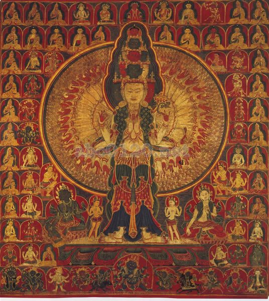 全面に広がる格子状の枠の中に、整列した黄帽派のラマ憎や無帽のラマ憎、仏陀、菩薩、護法尊が描かれている。白色の十一面千手観音の姿は、大きく輪になった千の手によって拡大され、唯一の大きな像となっている。真上にいるのは、阿弥陀(無量光)である。観音の両足の外側には、小さな2人の脇侍が立ち、その隣にそれぞれ白ターラーと縁ターラーが座っている。下の列にはさまざまな護法尊がいる。左から右に、黒い衣をつけたベルナクジェン、青色の大黒立像、白色の六臂大黒立像、大黒の従者2人、そのうちのひとりは熊に乗ったクシェトーラパーラ、次に大きな青色の大黒、従者、馬頭、ペンデン・ラモ、赤色の馬頭、そして温和な吉祥天。赤色で縁取られた青い雲が、暗青色の背景の空間に満ちている。