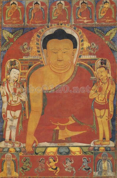 この仏画は四つの図像のグループからなる15人の尊像が描かれている。中央の尊像はまず間違いなく釈迦牟尼であり、結跏趺坐に座り、右手は触地印、左手は膝の上で平らに仲ばし禅定印とする。上段の五仏の肉髻の頂には赤い宝石の印が付いているけれども、中央の仏陀には付いていない(おそらく絵の具の層がすり減ってしまったのであろう)。
