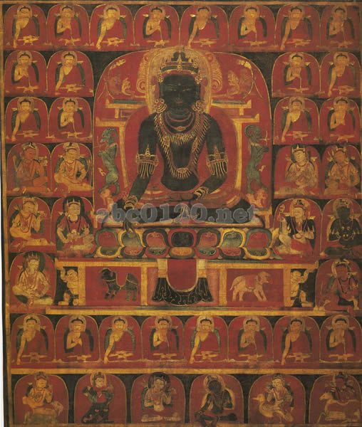 このタンカはハルパート・コレクションの大日と同一の様式であり、おそらく対となるものである。様式的にはこのタンカは後伝期の初期に属している。この阿閦の姿は11世紀前期から中期頃に制作されたツァンのキャンプ寺の2階の彫刻に関係がある、しかしキャンプ寺の彫刻はもう少し装飾が簡潔である。この尊像の様式の簡潔さはチョカン寺の初期の絵画にいくらかの類似が認められる。出所:天空の秘宝チベット密教美術展