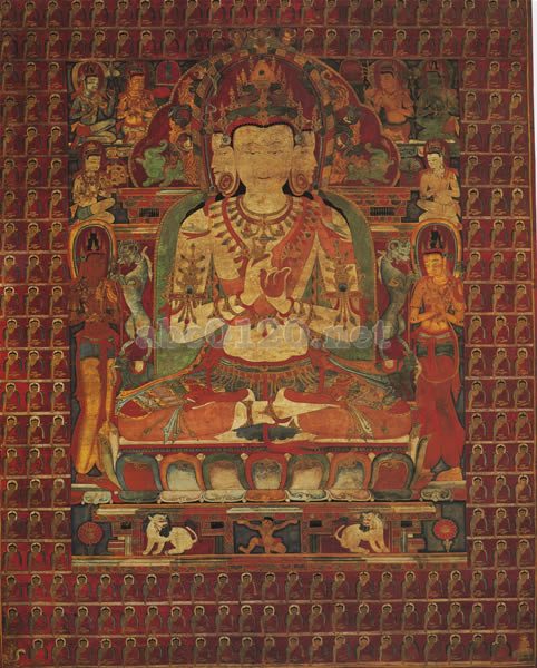 このタンカは疑いなく、この仏陀を描いた最も素晴らしい初期の作品である。その堂々とした姿は、盛り上げられた金色の豪華な装飾や、大量に使われているトルコ石の青や緑の色合い、桃色や赤の色彩のヴアラエティー、他には見られないような配色によって、ますます際だっている。衣や宝石の形式は、明らかに12世紀後期から13世紀前期の様式から伝えられているものであるが、ここではより力強い活気と全く規範的な生気を獲得しており、その特徴はシャル寺の壁画に見られるように14世紀前期まで増加してゆく。輪郭を取り囲む暗い色使いは、一切智大日の台座の周囲に控えめに用いられている-この技法は14世紀から15世紀の絵画を通じて用いられるが、だんだん目立ってくる。2人の大きな脇侍菩薩が、ともに説法印を結んで立っている。仏陀の右側は弥勒で、彼の侍つ花の上には瓶が載っている。仏陀の左側は文殊で、彼の持つ花の上には剣と経典が載っている。この2人の菩薩は脚がとても長い。この目立った特徴は、13世紀から15世紀にかけてよく見られるが、チベットの芸術家がインドやネパールの芸術から受け継いだ仏画の様式的な伝統を、自分たちで解釈して発展させたものである。両側上隅に3人ずつの菩薩が描かれているが、その左端に青文殊が含まれている。これらの菩薩や、極めて詳細に描かれた奇抜なデザインの台座の背板の上部、一切智大日の光背の隙間には法輪、金剛杵、紅蓮華、青蓮華に載った剣といった象徴的なものが、それぞれ赤い光背や龕をともなって散りばめられている。裏面には赤インクを用いてウメ文字の銘文が記されているが、残念ながらほとんど読むことができない。 この絵の様式は、奔放で華麗であると同時に精密で優美であり、作品の繊細さと力強さの両方を巧みに強めている。この作品は13世紀中期の主流をなした様式の作品群に含まれるものであり、おそらくチベット中央部のカギュ派の作品に関係がある。そして、クリーヴランド美術館にある緑ターラーや13世紀から14世紀のサキャ派関係の仏画に見られる様式的な伝統とは、多少異なっている。出所:天空の秘宝チベット密教美術展