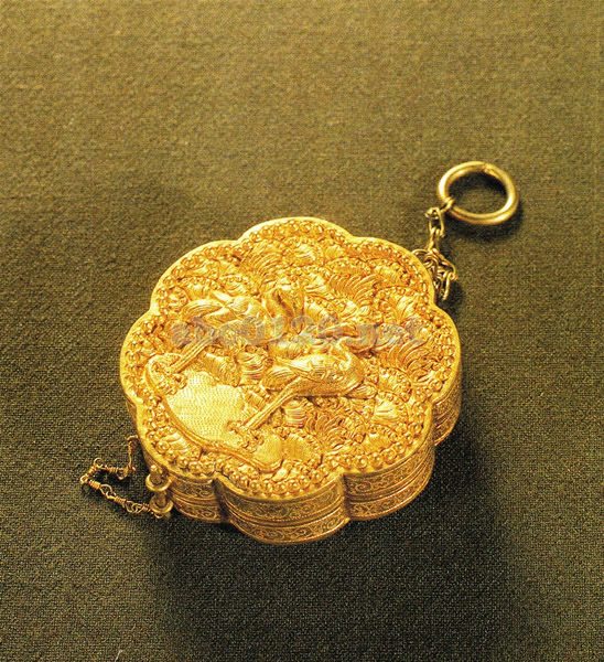 八曲連弧型で留め金の付いた蓋物である。外側に金の鎖が付き、帯に下げていた。表には水に遊ぶ鴛鴦、裏には一対の仙鶴が打ち出されている。文様は半浮き彫りで、緻密な細工で大変美しい。出所:北方騎馬民族の「黄金マスク展」