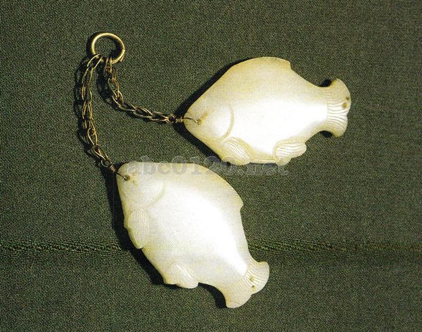 遼時代 1986年内蒙古自治区のチェリムモン盟陳国公主墓出土 玉 長さ10cm 白玉製の丸彫り。口部の金鎖で金輪と繋がっている。出所:北方騎馬民族の「黄金マスク展」 関連用語: