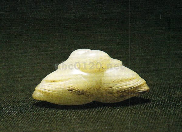 白玉製丸彫り。一対の鴛鴦が相睦んで臥している。体はふっくらとして、重ねた羽、下げた短い尾の表現が非常に愛らしい。頚部の穴は携帯の際の紐通しと考えられる。出所:北方騎馬民族の「黄金マスク展」