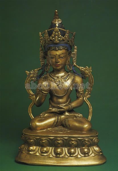 この時代の西チベットの銅像は、この像のように仏陀の台座を飾る大きな蓮弁の形や数(通常7枚から9枚)に特徴がある。14世紀の西チベットの様式に見られるもうひとつの特徴は、宝冠の上に突き出した、高く結った宝髺と、宝冠の飾りと飾りや宝冠と彫刻の他の部分とをつなぐ細い金属製の支柱である。出所:天空の秘宝チベット密教美術展
