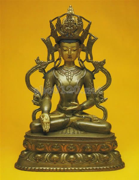 宝生は、普通は南方に配される、五仏のうちの3番目の如来である。宝生は、慢を平等性智に転換する。宝生は、宝部の仏陀の主尊である。宝生はチベットではそれほど親しまれていなかったので、その像はあまりない。この直前にあげたいくつかの像と同様、この像も菩薩(または報身の仏陀)の姿に表現される。右手は与願印、左手は禅定印を結ぶ。出所:天空の秘宝チベット密教美術展