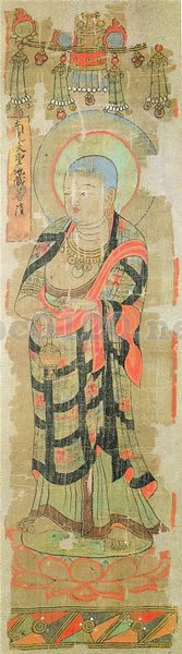 敦煌ては,この僧形の単独像はもちろんのこと,被帽の地蔵菩薩像,六道図を伴った地蔵菩薩像,地蔵十王図,十王経図巻などの形でしばしば登場しており,当時の敦煌の民衆から絶大な人気を得ていたことが知られる。僧形の地蔵菩薩は,持物として宝珠と錫杖を持つことが多いが,本図は右手に水瓶を持つだけである。本図は剥落が著しいものの,まだよく彩色をとどめており,剃髪した頭や髭の部分に塗られた青色,袈裟の裏地の朱色などが鮮やかである。地蔵菩薩の慈悲心が,柔らかい描線で巧みに描かれている。 出所:大英博物館所蔵日本・中国美術名品展